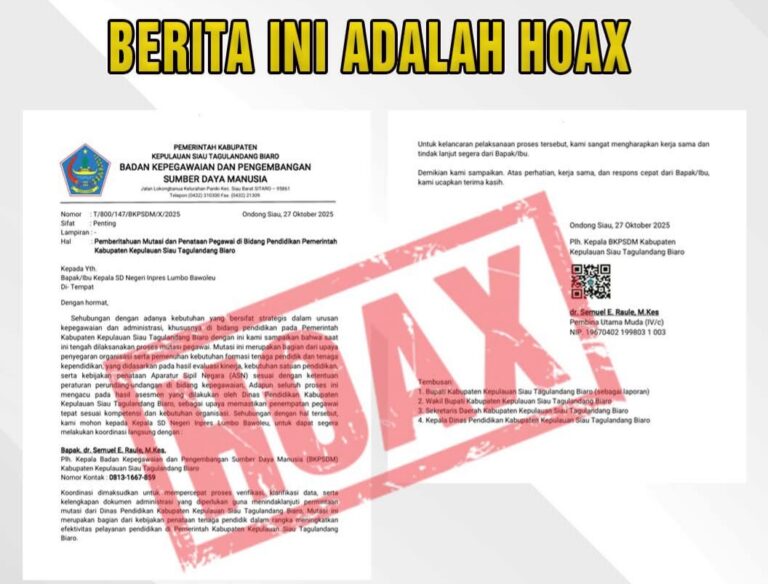 Lebih lanjut diterangkan dalam surat hoax itu bahwa, seluruh proses mutasi mengacu pada hasil asesmen yang dilakukan oleh Dinas Pendidikan Kabupaten Sitaro sebagai upaya dalam penataan penempatan pegawai sesuai kompetensi dan kebutuhan organisasi.