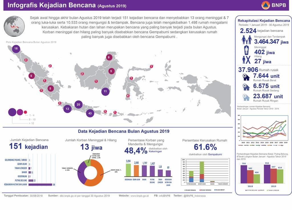 Sementara itu, Plt Kepala Pusat Data Informasi dan Humas BNPB, Agus Wibowo mengungkapkan, catatan BNPB pada awal hingga akhir Agustus 2019 telah terjadi 151 bencana yang berdampak pada korban meninggal 13 jiwa, luka-luka 7 dan mengungsi atau terdampak sejumlah 10.533. Sedangkan kerusakan, sebanyak 1.498 rumah mengalami kerusakan dengan kategori berbeda. “Korban meninggal timbul dipicu oleh gempa bumi, sedangkan rumah rusak dominan oleh gempa bumi dan disusul puting beliung serta banjir,” ujarnya.