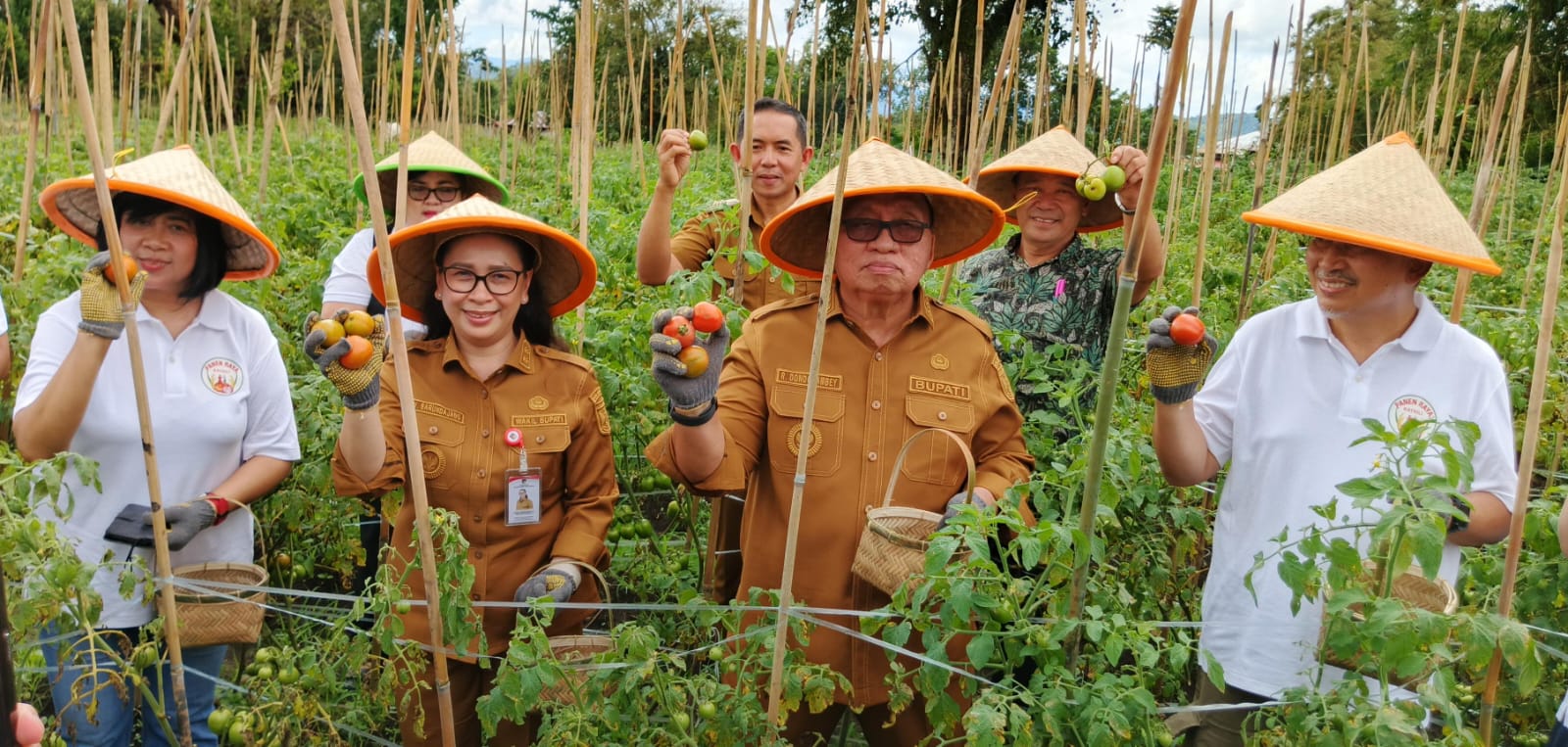 Selanjutnya Bupati dan Wakil Bupati Minahasa, Kapolres Minahasa dan undangan lain menuju lahan perkebunan untuk melaksanakan panen dengan memetik tomat, kacang batik dan bawang merah yang adalah tanaman yang diusahakan Pria Kaum Bapa Getsemani Tonsewer dan KGPM dengan menggunakan booster katrili yang dihasilkan oleh Pertamina Geotermal Energi. (herdi)