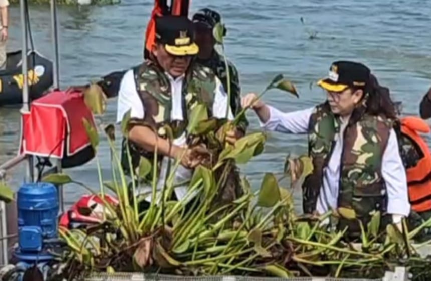 Kunjungan Gubernur Sulut di Danau Tondano yang juga didampingi Kapolda Sulut Irjen Pol Roycke Harry Langie dan Pangdam XIII Merdeka Mayjen TNI Suhardi untuk meninjau langsung proses pembersihan eceng gondok di Danau Tondano, yang menggunakan alat bantuan dari Presiden Prabowo Subianto.